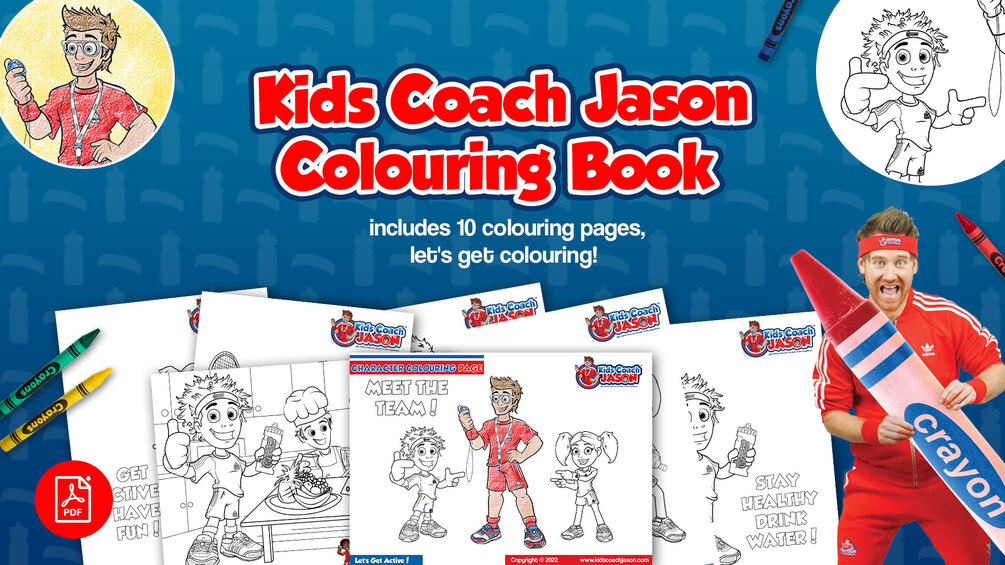 You'll receive x10 fun Kids Coach Jason colouring sheets from our FUN Active Games pack for 3-6 years - featuring Kids Coach Jason and his two healthy, active characters 'FI' & 'T-NESS'.